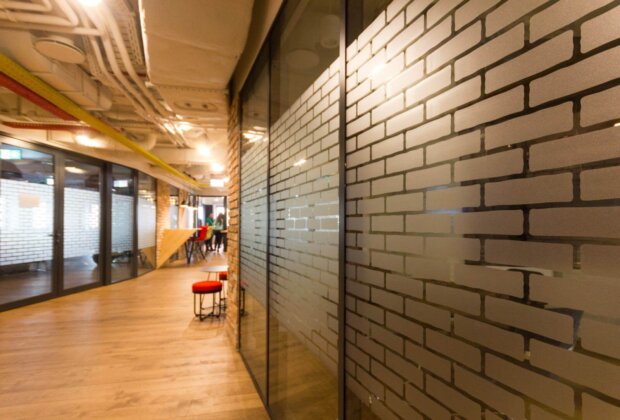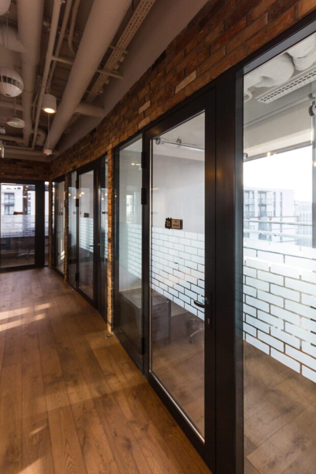 Ze względu na przeznaczenie powierzchni musieliśmy przygotować przeszklenia tak aby zachować przestrzeń otwartą a jednocześnie zapewnić prywatność – oklejonych zostało kilkaset metrów kwadratowych folią szronioną.