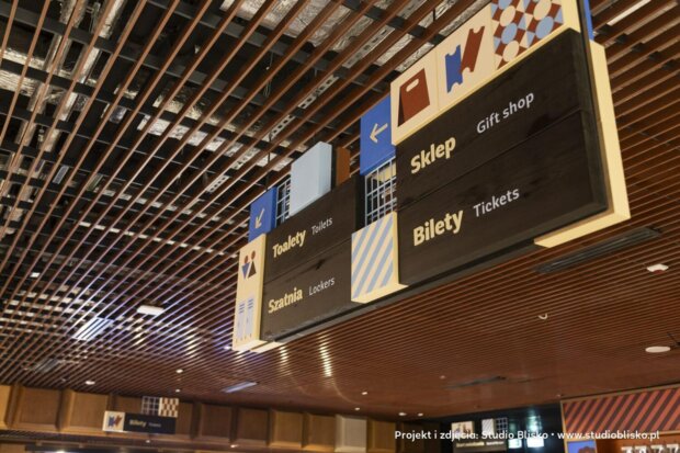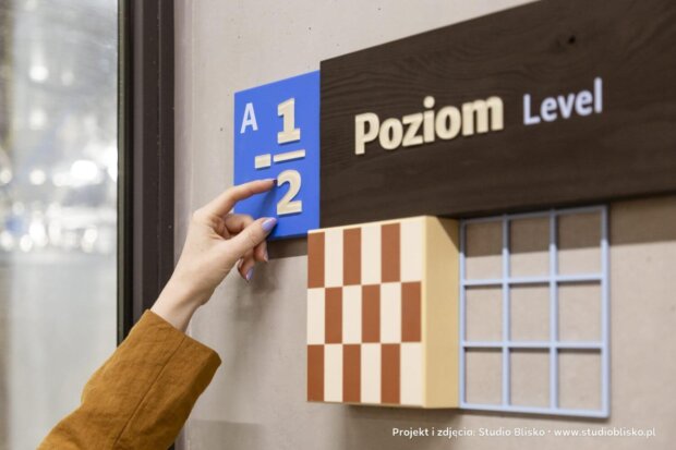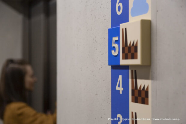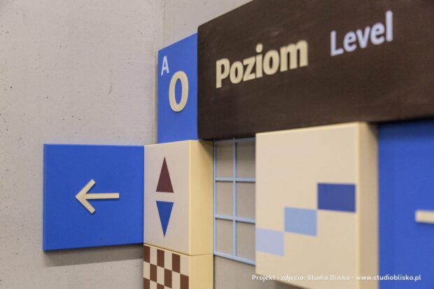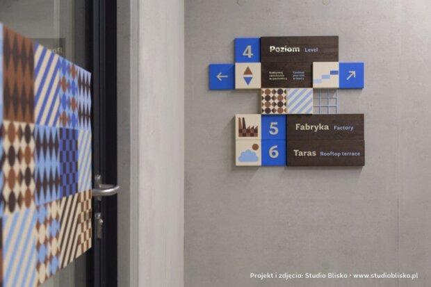 Projekt obejmował stworzenie ponad 370 kostek zróżnicowanych pod względem rozmiaru, grubości i kolorów, wykonanych z różnych materiałów, takich jak drewno, plexi, aluminium, MDF i dibond. Każdy element systemu wayfindingu został pieczołowicie zaprojektowany, wykorzystując 6-8 różnych materiałów, z różnorodnym wykończeniem – od bejcowania, przez lakierowanie, po nadruki na plexi i folii ploterowej.